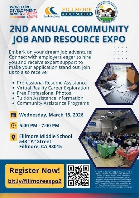 Join us for the 2nd Annual Job & Career Expo hosted by Fillmore Adult School in partnership with the Workforce Development Board of Ventura County. Connect with local employers, explore training programs, and take the next step toward building your future right here in our community.