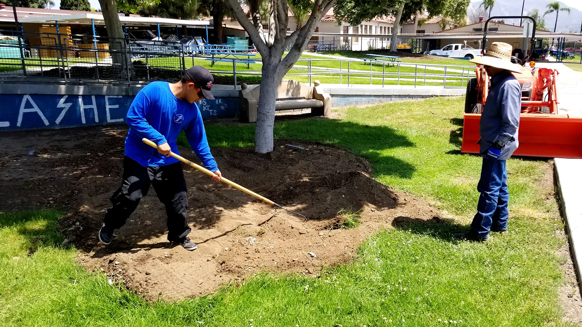 The Kubota tractor was used to dump and spread new dirt around the center quad area to help level the ground. The final leveling touched were done by hand.