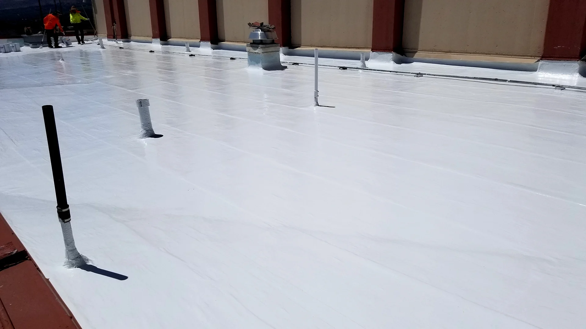 The entire High School Gym is getting a fresh roof. Above workers are roofing just one of the lower elevation sections of the roof.