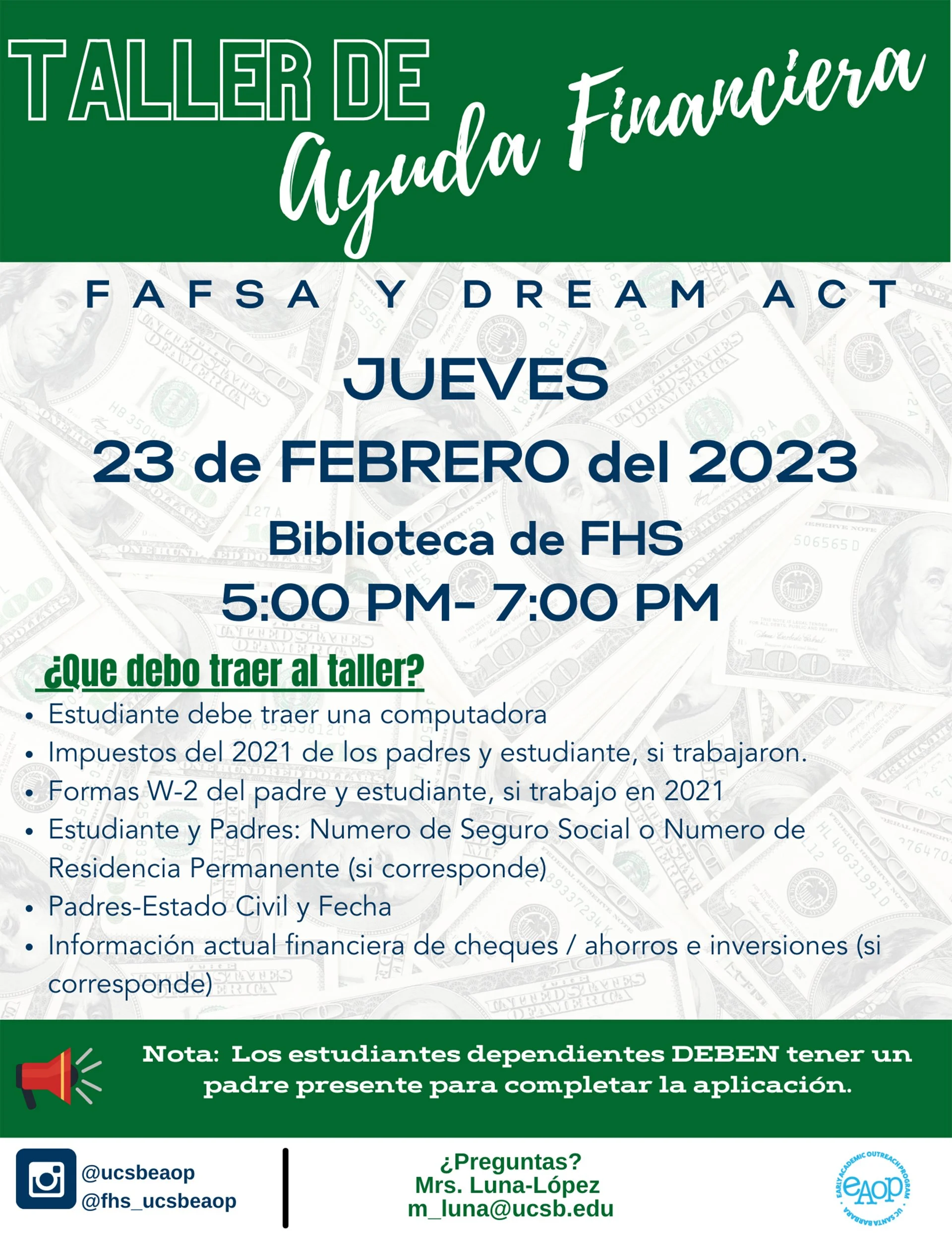 Last Call for Seniors: If you have not completed your FAFSA/CA Dream Act application, make sure to attend our LAST financial aid workshop on Thursday, February 23, 2023 at 5:00 PM-7:00 PM in the Library. Please bring in the following items: Laptop/Charger, Parent/Student 2021 Income Taxes, Parent/Student W2's, Student and Parent's Social Security Number or Permanant Resident (If Applicable), Parent's Marital Status/Date, current checking/savings and investment information.