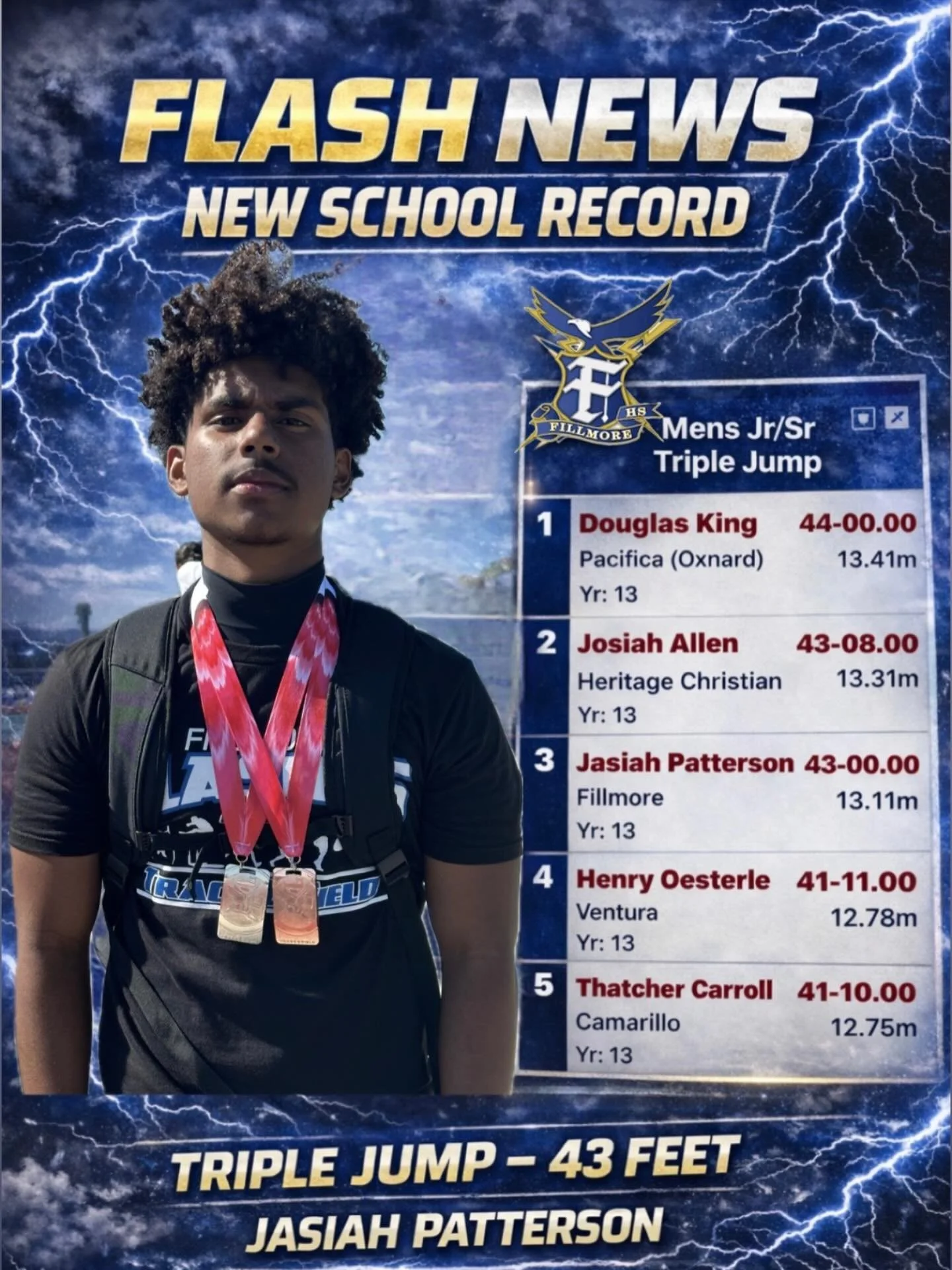 Jasiah Patterson set a new school record with a triple jump of 43 feet. The school record was 42 feet 4 1/2 inches set in 1987 by Chris Wright.