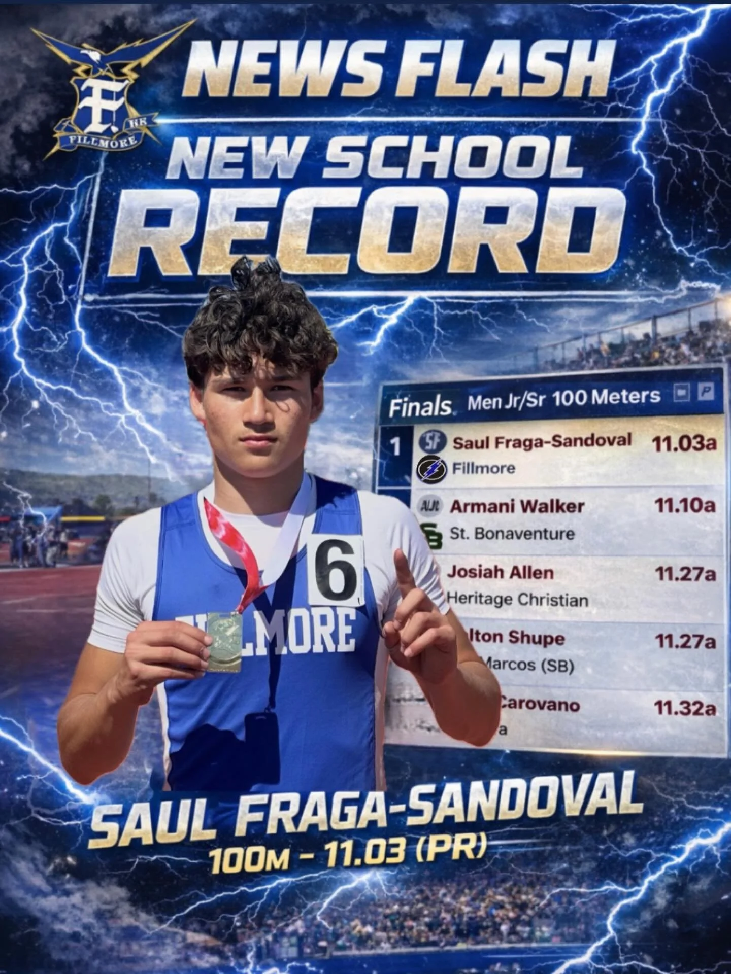Saul Fraga-Sandoval set a new school record in the 100 meter with a time of 11.03. The school record was 11.05 set in 1959 by Ken Stout, then by Joe Cook in 1961, and by Mike Burt in 1980.