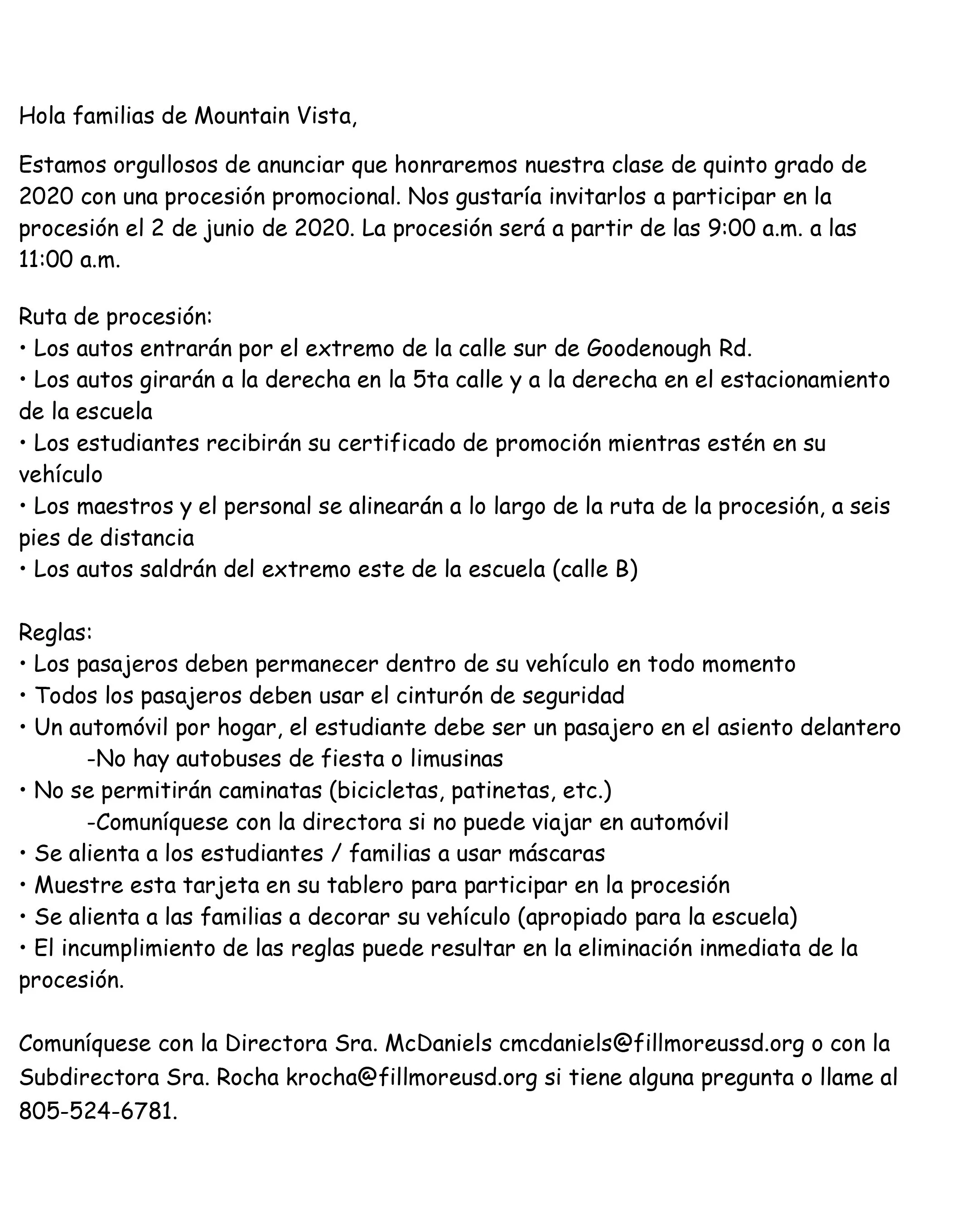 Estamos orgullosos de anunciar que honraremos nuestra clase de quinto grado de 2020 con una procesión promocional. Nos gustaría invitarlos a participar en la procesión el 2 de junio de 2020. La procesión será a partir de las 9:00 a.m. a las 11:00 a.m.