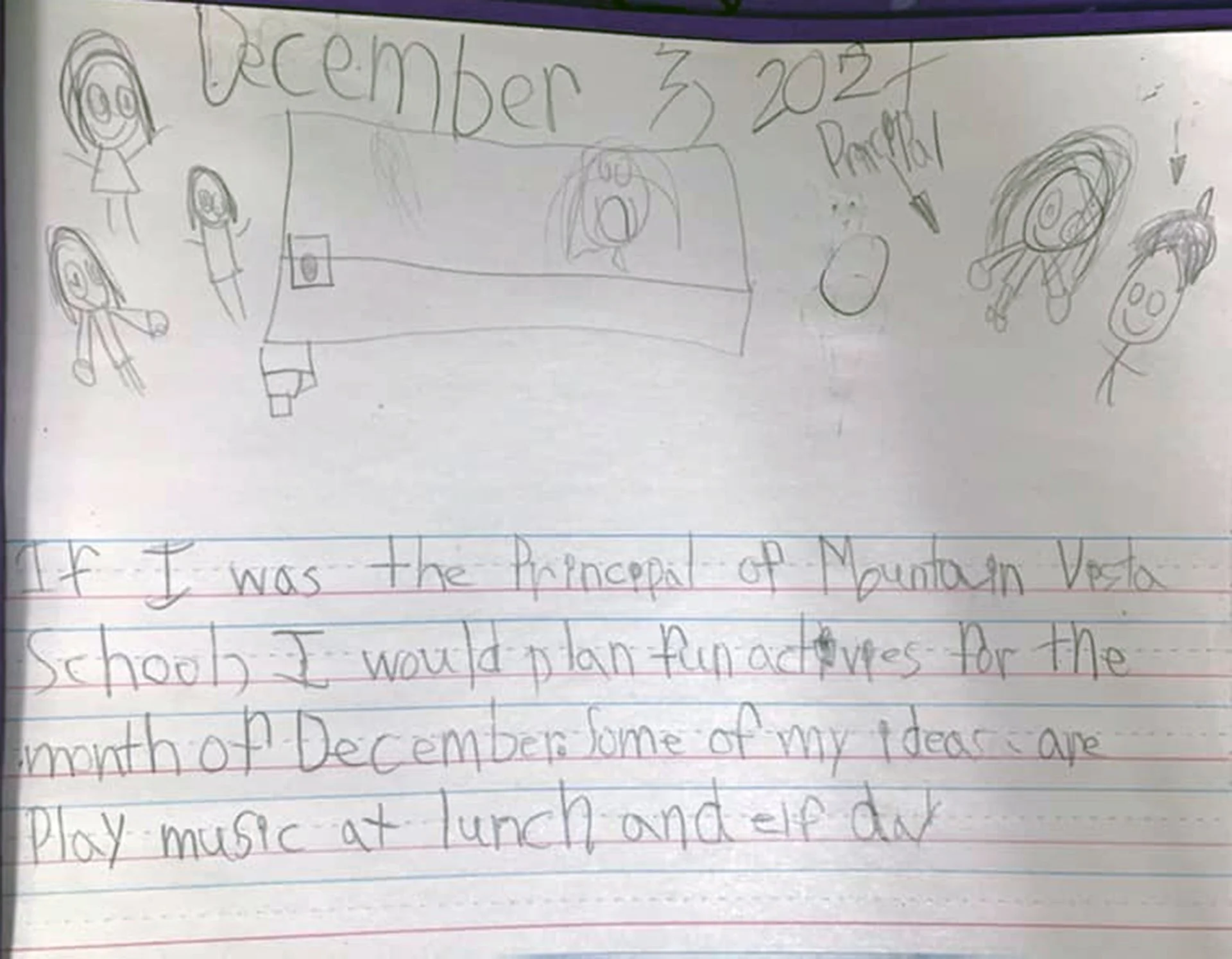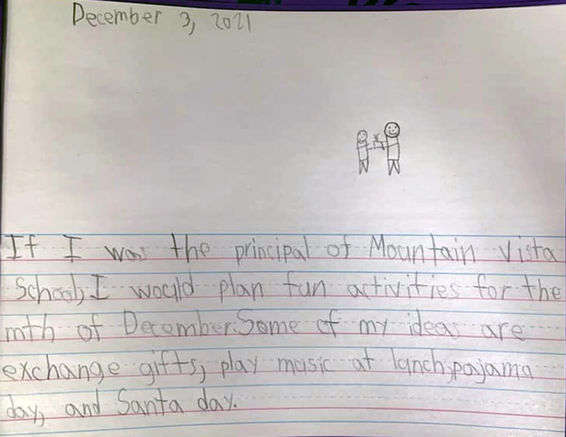 December 18, 2021 Isabella Ruiz 2nd Grade shared their thoughts if they were principal of Mountain Vista December 18, 2021 Isabella Ruiz Mrs. Gray's 2nd grade students share their thoughts if they were principal of Mountain Vista School. Isabella Ruiz