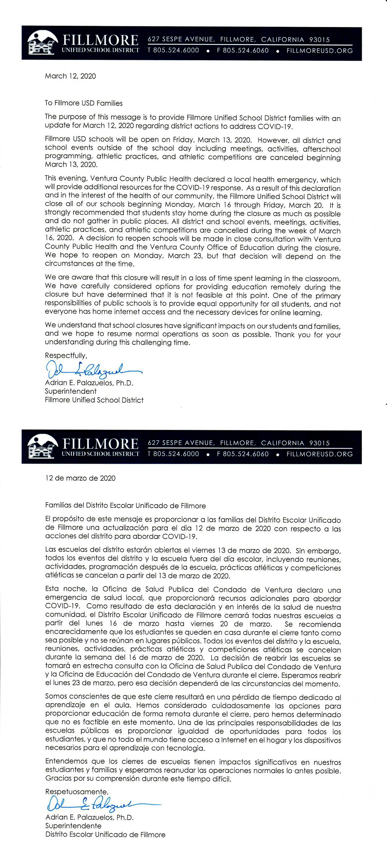 English/Spanish All Fillmore Unified School Campuses OPEN Friday March 13. All School Campuses CLOSED Monday March 16 through Friday March 20