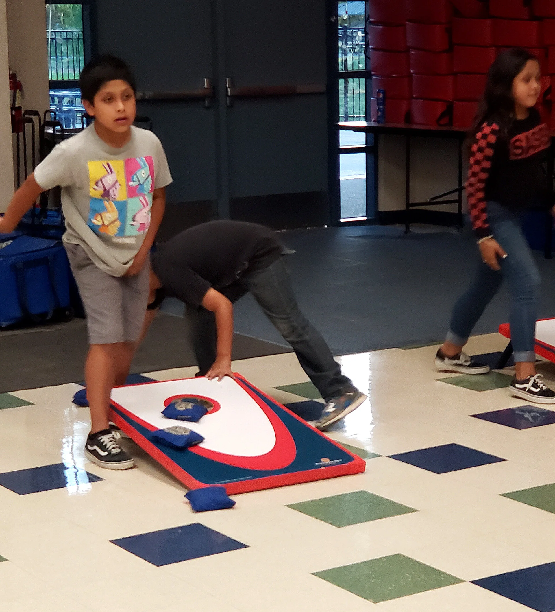 5th graders enjoying a game of corn hole at lunch.