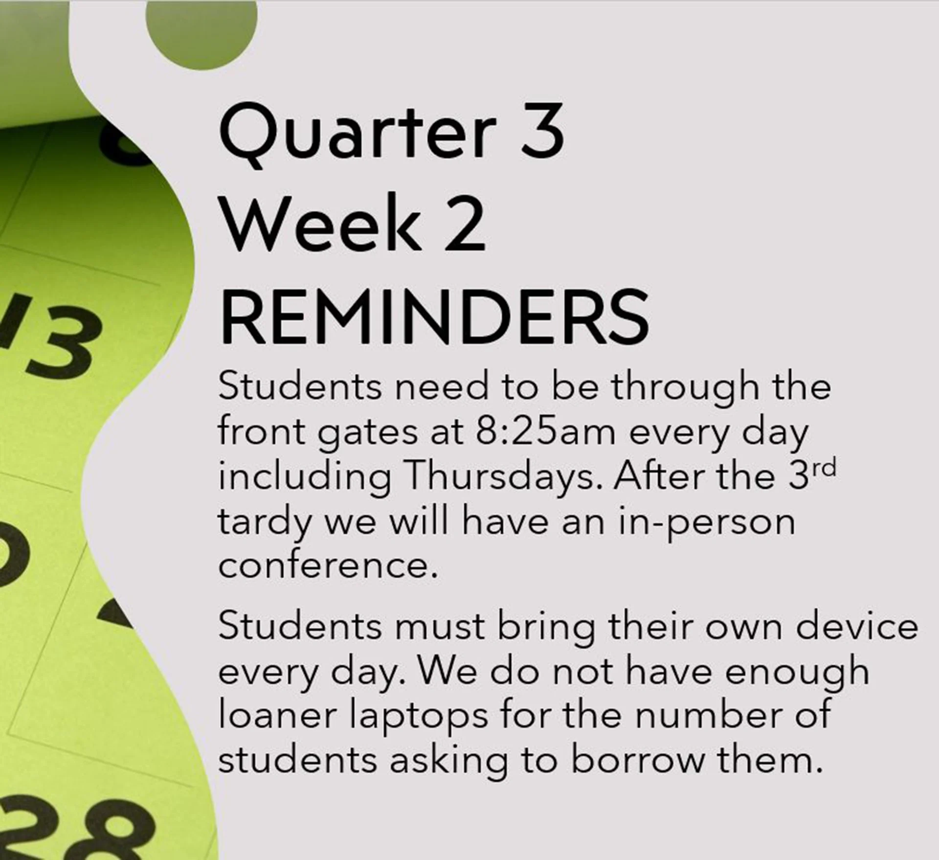 1) Students need to be through the gate by 8:25am. Any later than that and they are not getting to their class before the late bell. Tardies impact their learning time and can affect their grades. Our program is accelerated and every minute in class counts. After 3 tardies we will call to arrange an in-person conference with their parent or guardian.